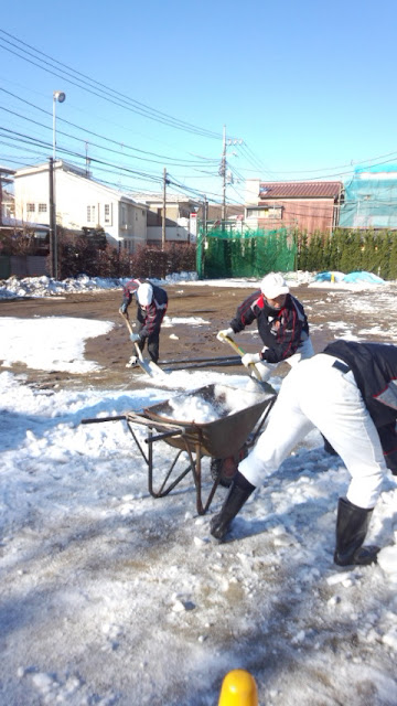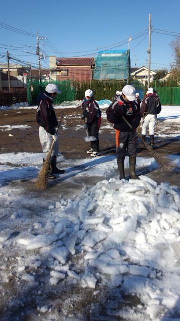 そして 今日は部員全員での作業。 9:00から除雪、融雪、水抜きとみんなで頑張りました。 それでも、完璧とは言えない状態までしか整備できませんでした。 明日 このまま 凍らずにいてくれれば、砂をまいて 練習はできると思います。 また第四期生の選考会も順調にこなせれば良いと祈っています。
